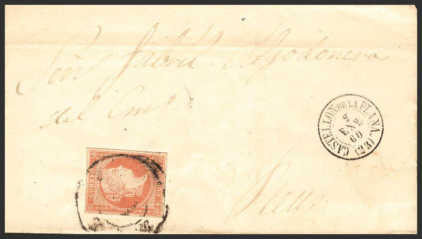 48. 1860. 4 cuartos rojo. CASTELLON a REUS. Matasello R. CARRETA Nº 23. ESCASAMENTE LEGIBLE.