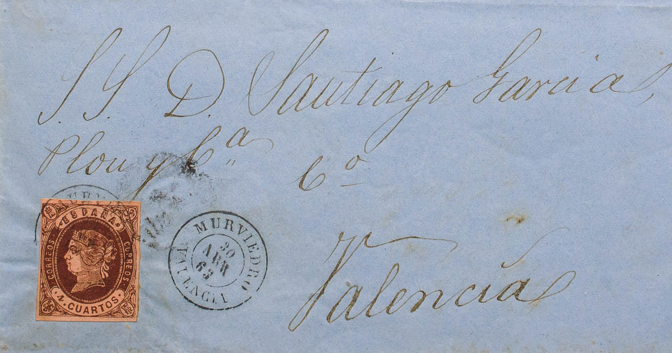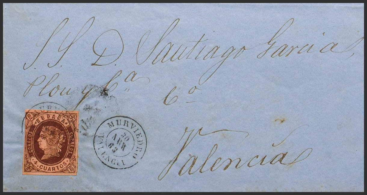 58. 1863. 4 cuartos castaño. MURVIEDRO a VALENCIA. Matasello MURVIEDRO / VALENCIA. MAGNIFICA.