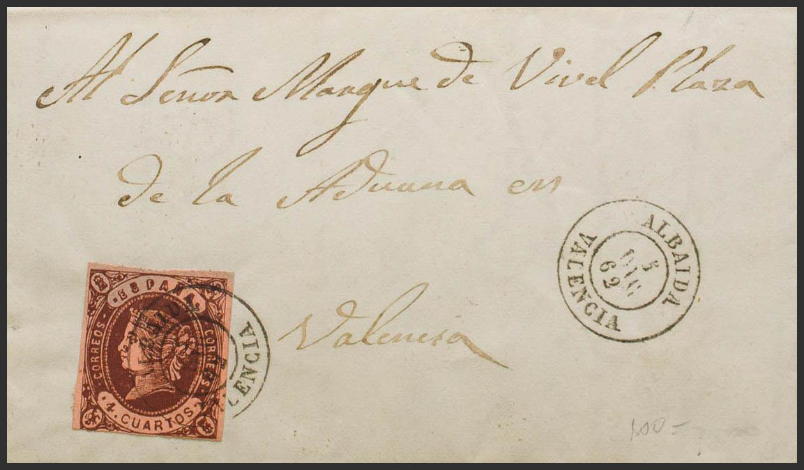 58. 1862. 4 cuartos castaño. ALBAIDA a VALENCIA. Matasello ALBAIDA / VALENCIA. MAGNIFICA Y MUY RARA.