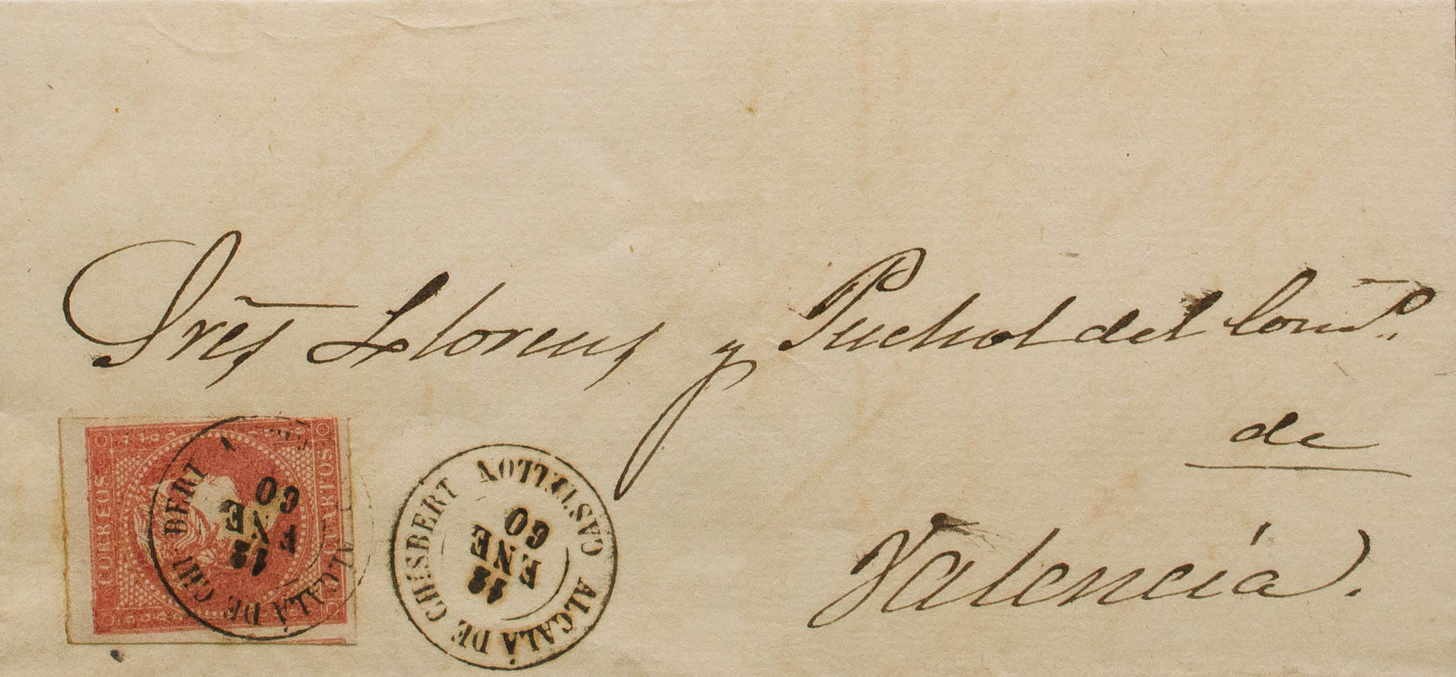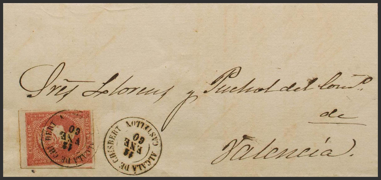 48. 1859. 4 cuartos rojo. ALCALA DE CHISVERT a VALENCIA. Matasello ALCALA DE CHISVERT / CASTELLON. MAGNIFICA Y RARA.