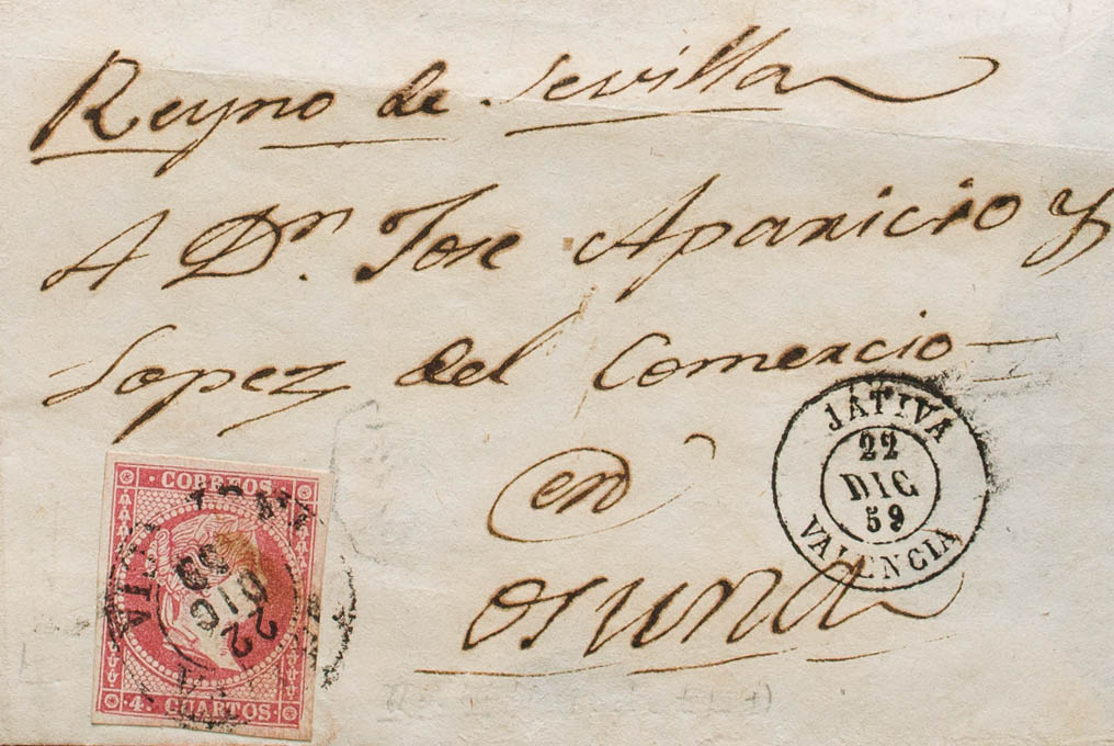 48. 1859. 4 cuartos rojo. JATIVA a OSUNA. Matasello JATIVA / VALENCIA (Tipo I) y JATIVA / VALENCIA (Tipo II), en el frente. MAGNIFICA.