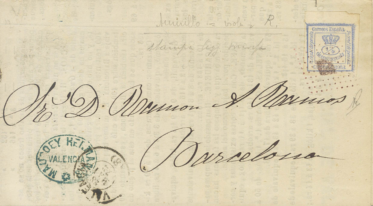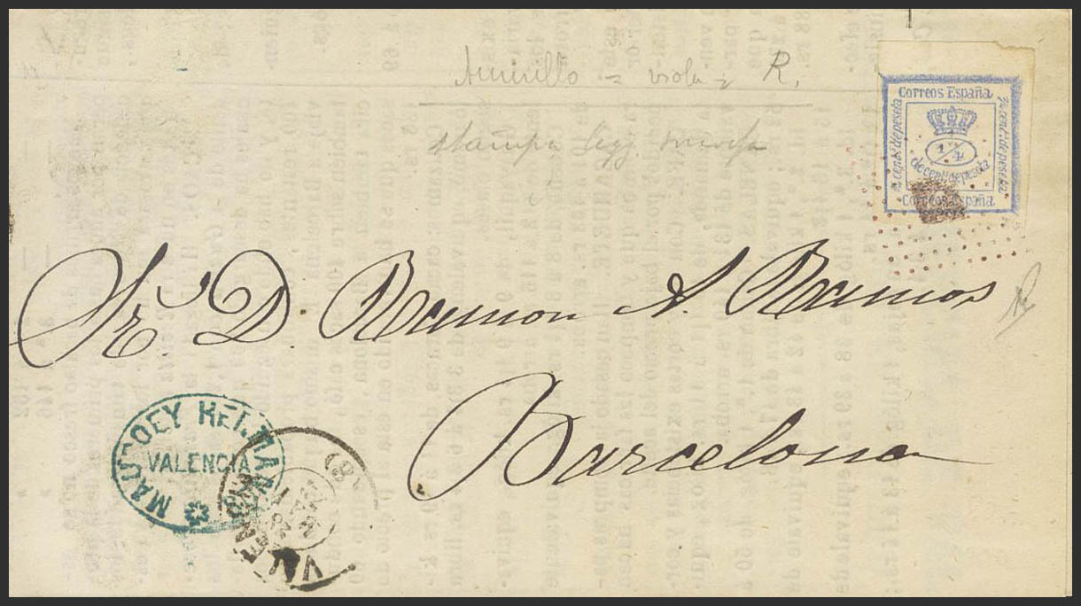 115. 1873. ¼ cts ultramar. Impreso de VALENCIA a BARCELONA. Matasello ROMBO DE PUNTOS (muy limpio). MAGNIFICA.