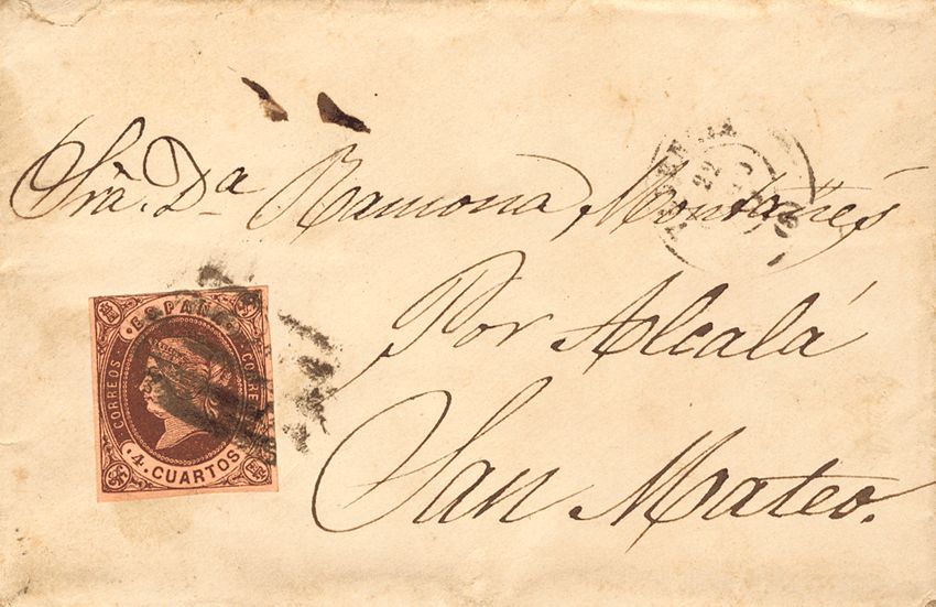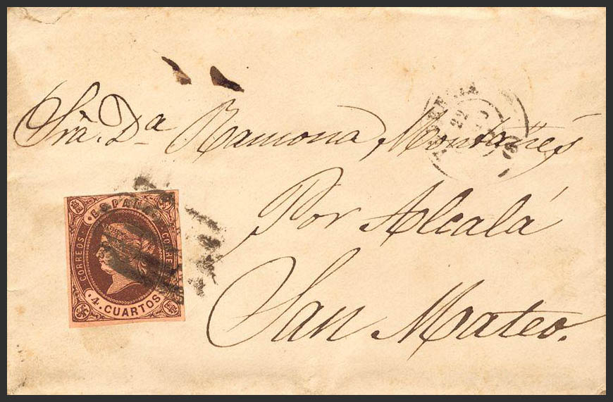 58. 1863. 4 cuartos castaño. VALENCIA a SAN MATEO. Matasello BARRAS DE VALENCIA. BONITA Y RARA.