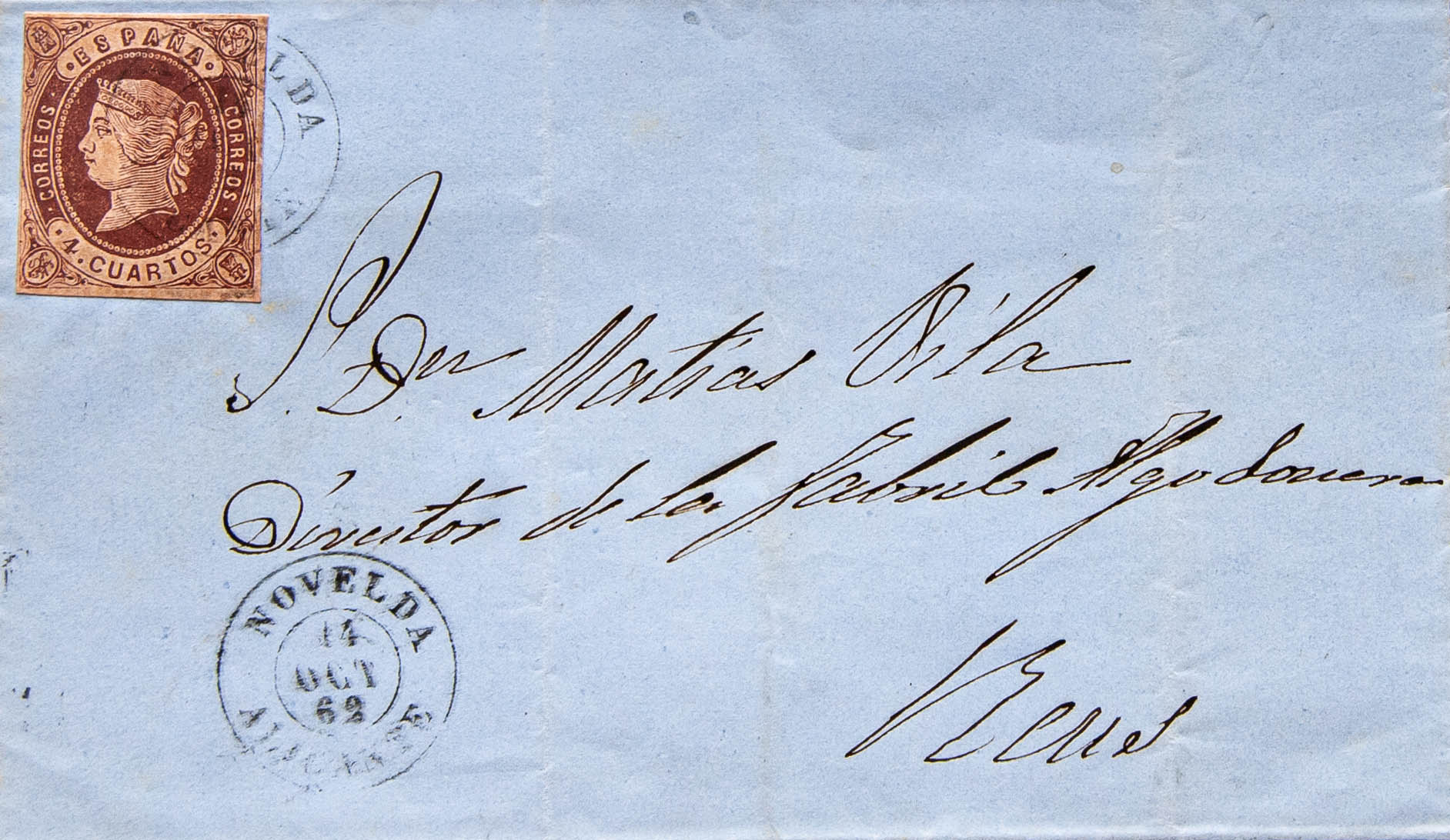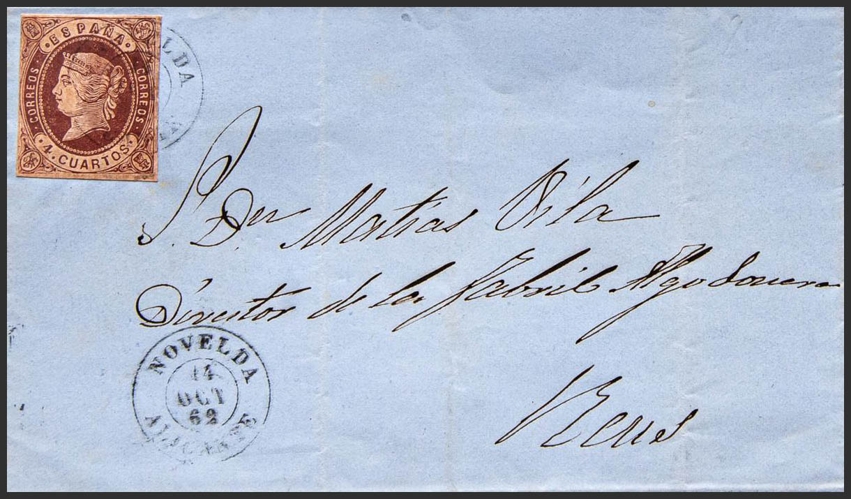58. 1862. 4 cuartos castaño. NOVELDA a REUS. Matasello NOVELDA / ALICANTE. MAGNIFICA.