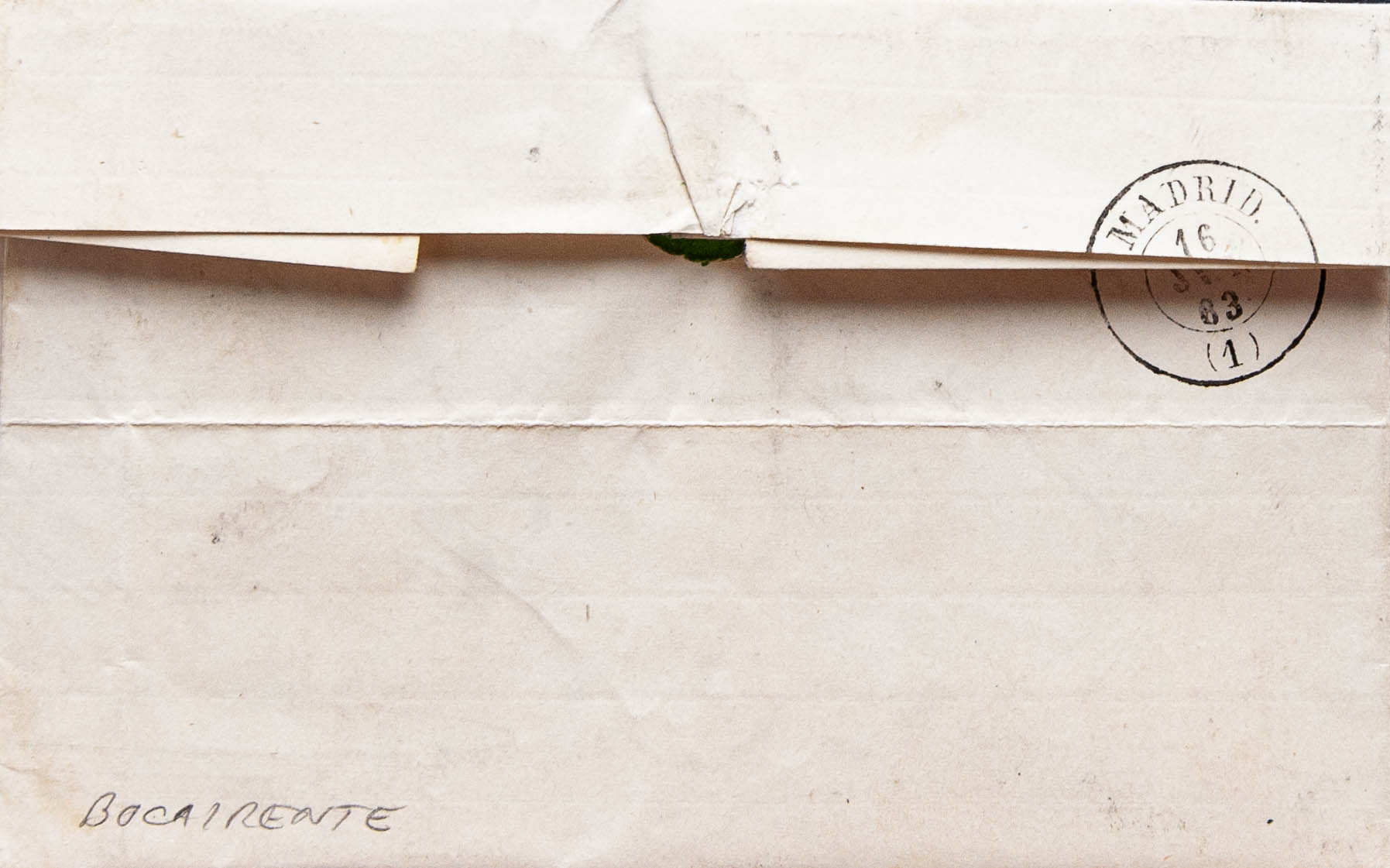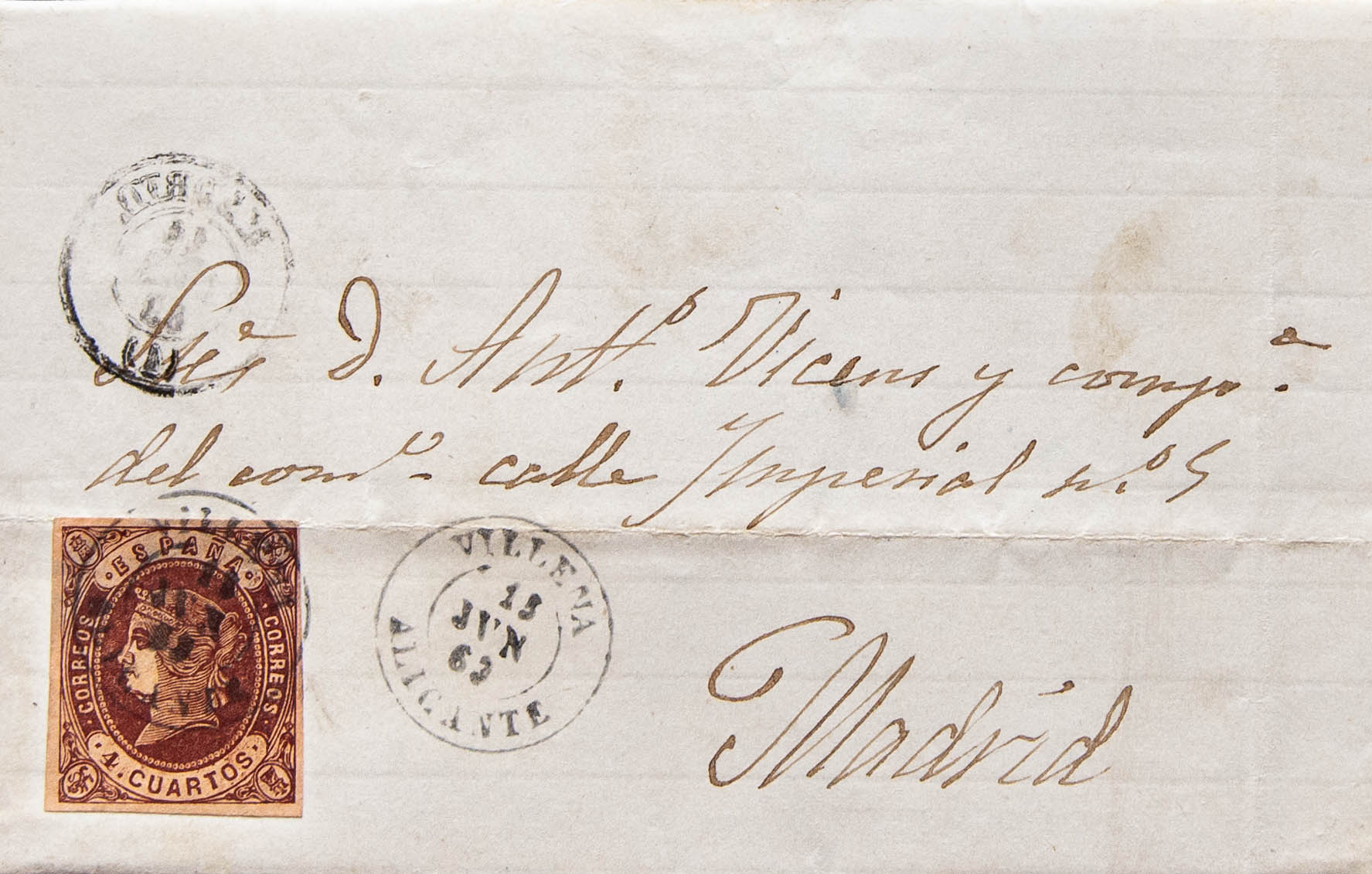 58. 1863. 4 cuartos castaño. BOCAIRENTE (VALENCIA) a MADRID. Matasello VILLENA / ALICANTE. MAGNIFICA.