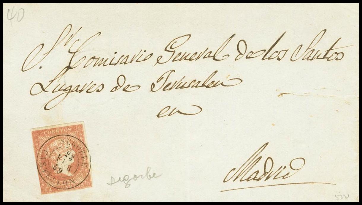 48. 1859. 4 cuartos rojo. Frontal de SEGORBE a MADRID. Matasello SEGORBE / CASTELLON. MAGNIFICO.