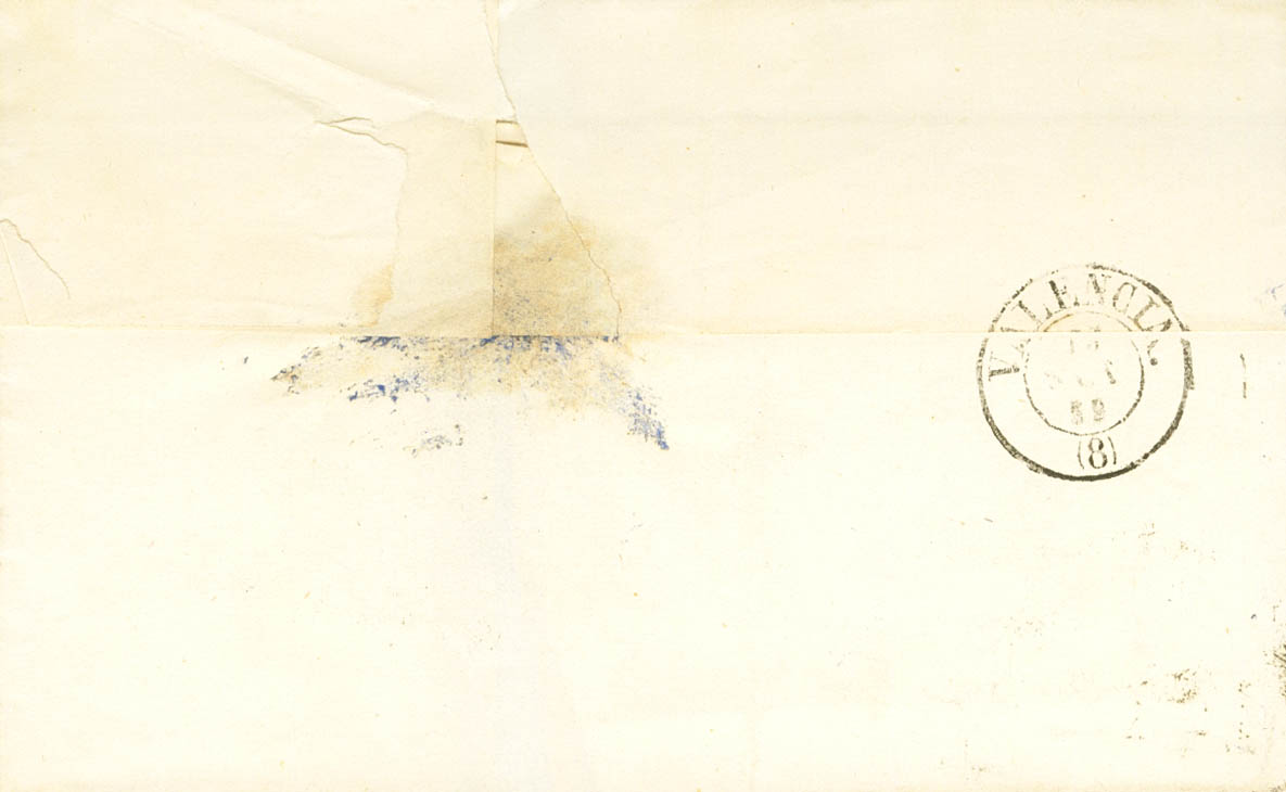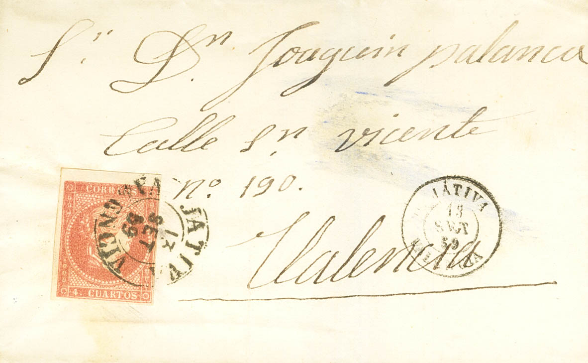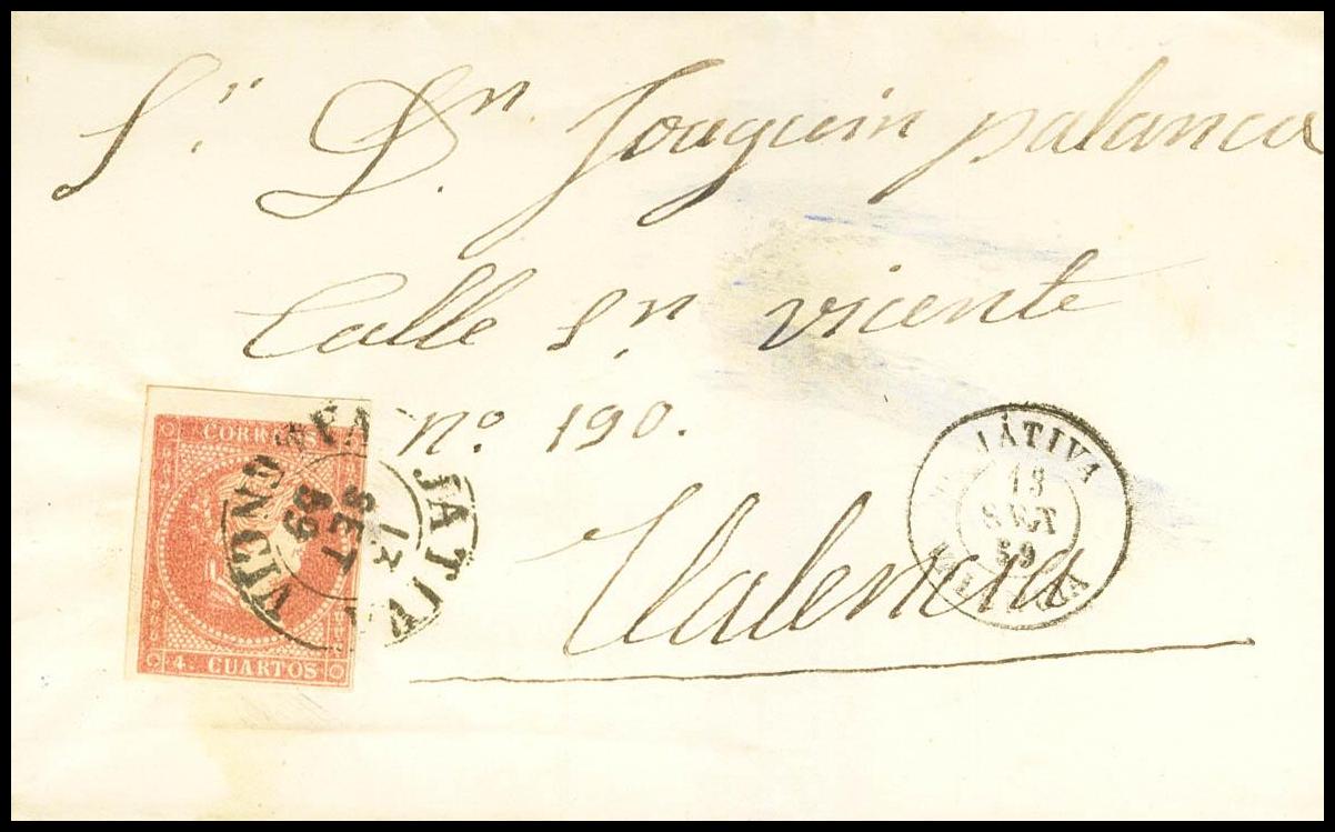 48. 1859. 4 cuartos rojo. JATIVA a VALENCIA. Matasello JATIVA / VALENCIA (Tipo I), en el frente JATIVA / VALENCIA (Tipo II). MAGNIFICA.