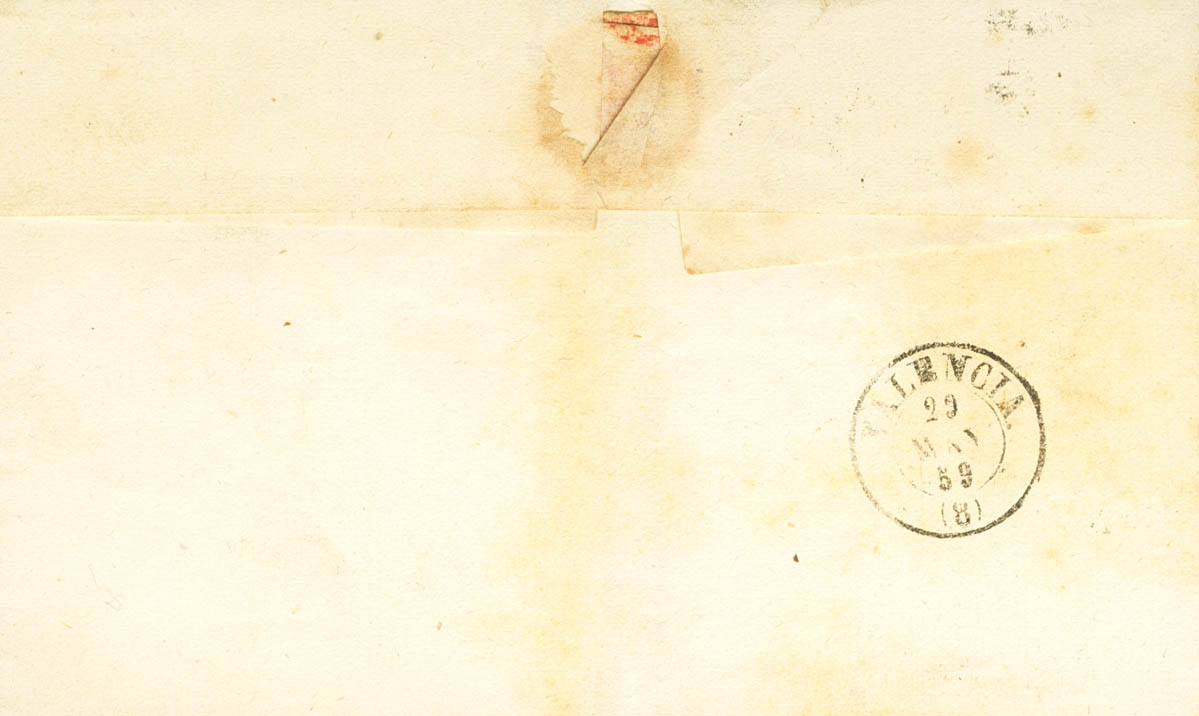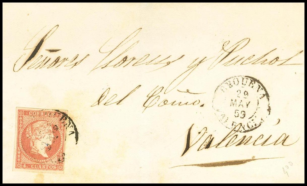 48. 1859. 4 cuartos rojo. REQUENA a VALENCIA. Matasello REQUENA / VALENCIA (Tipo I). BONITA Y MUY RARA.