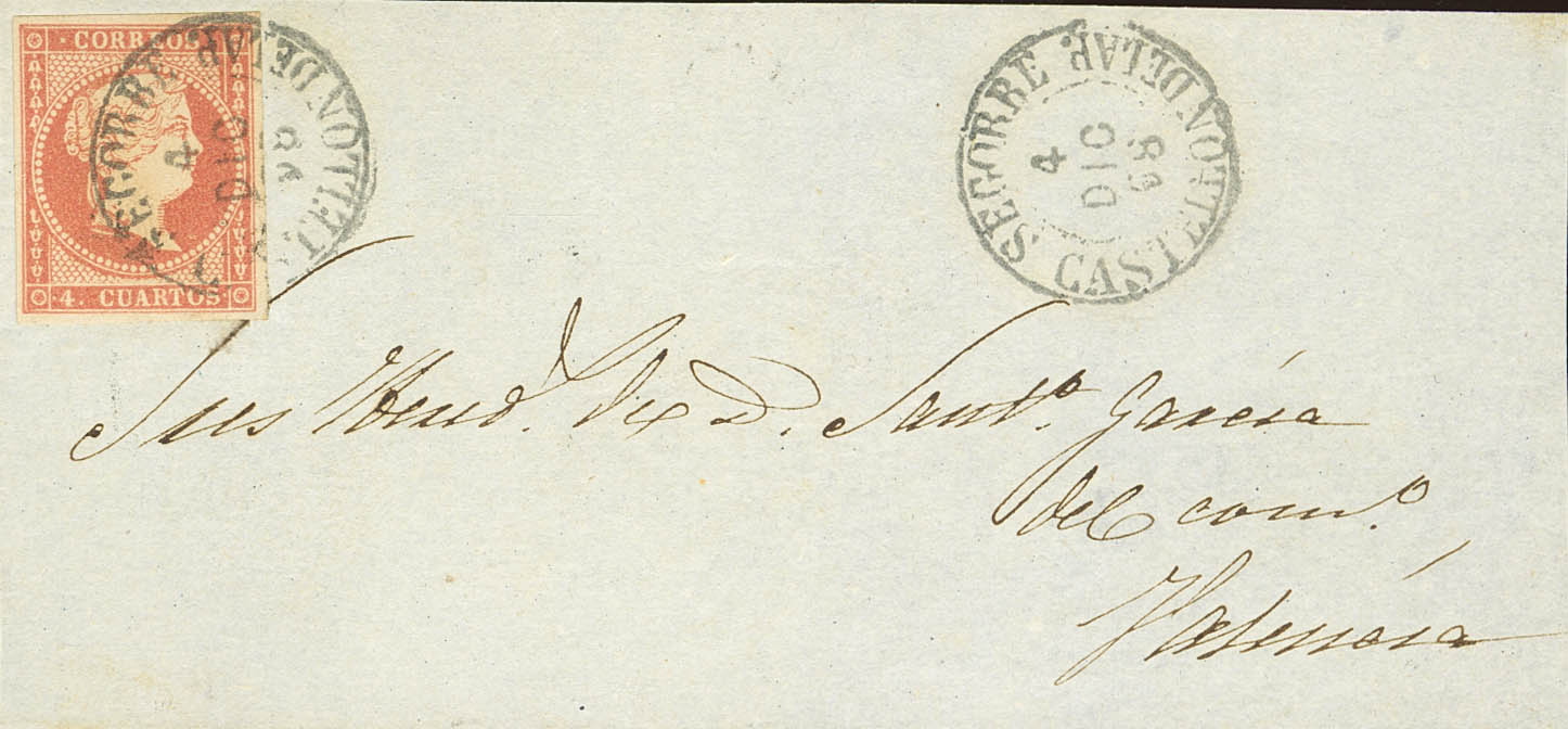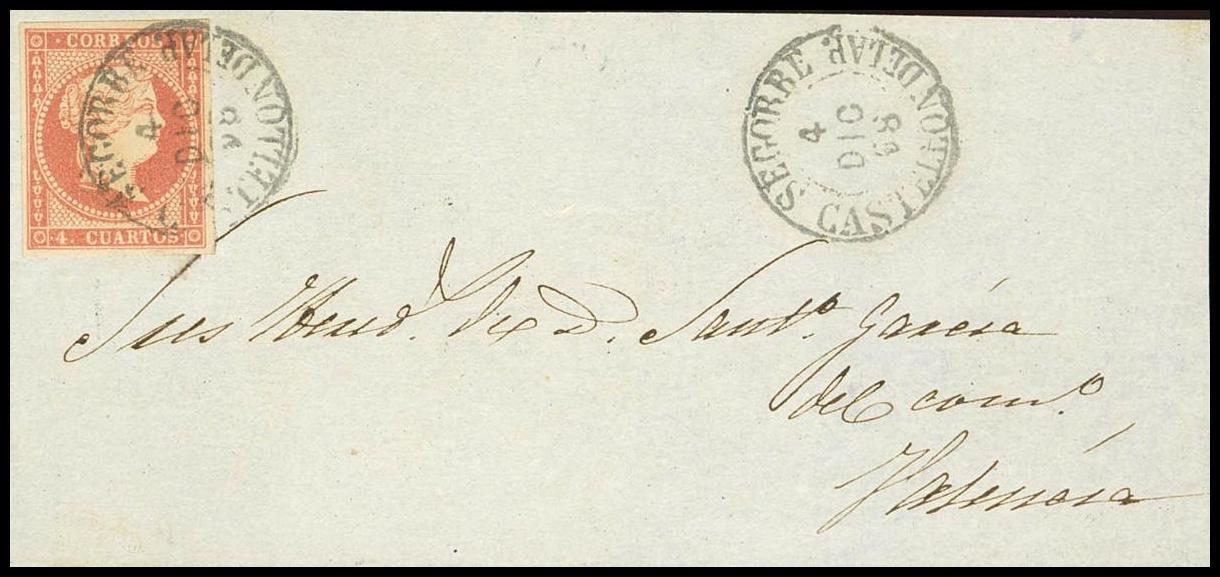 48. 1858. 4 cuartos rojo. Frontal de SEGORBE a VALENCIA. Matasello SEGORBE / CASTELLON DE LA P. (Tipo I). MAGNIFICO Y MUY RARO.