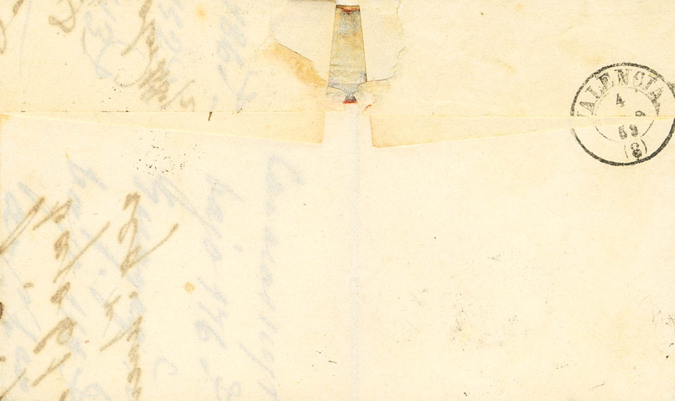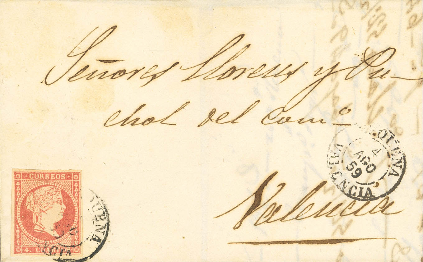 48. 1859. 4 cuartos rojo. REQUENA a VALENCIA. Matasello REQUENA / VALENCIA (Tipo I). BONITA Y MUY RARA.