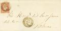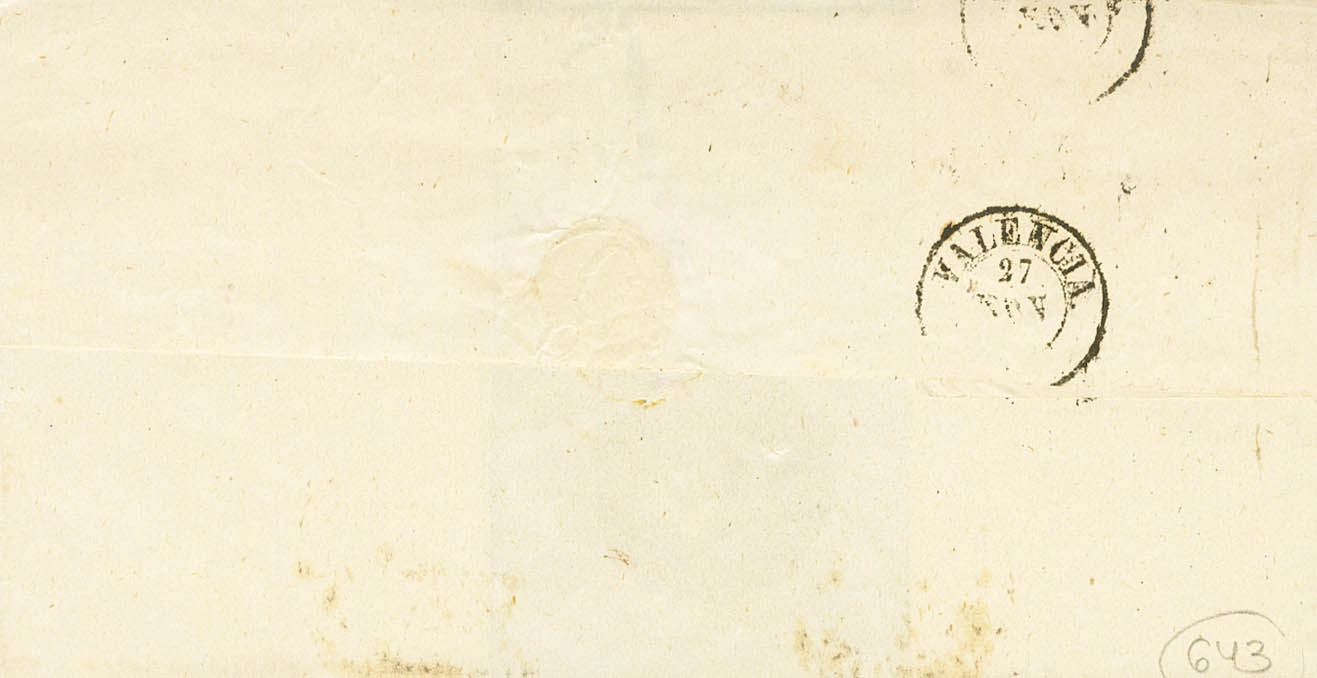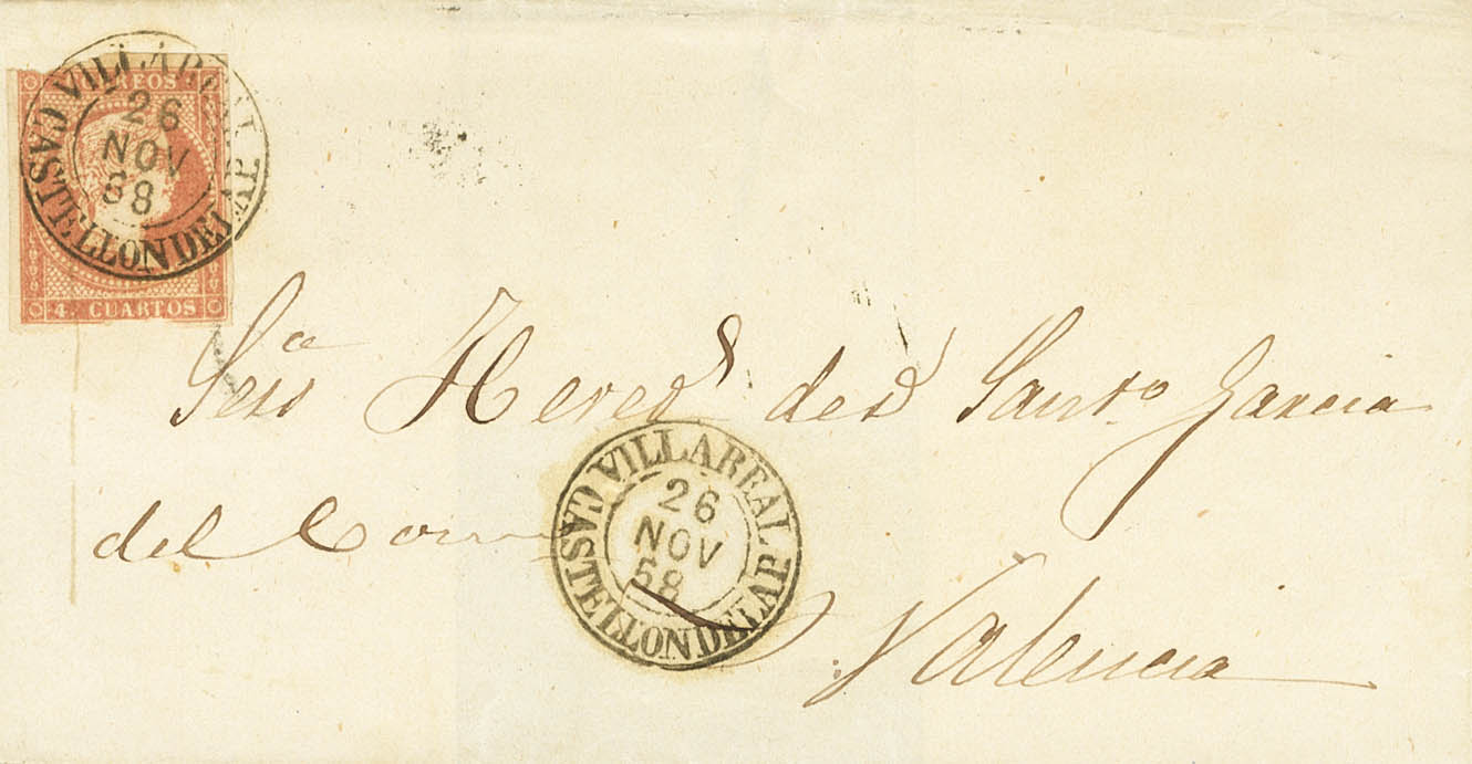 48. 1858. 4 cuartos rojo. VILLAREAL a VALENCIA. Matasello VILLAREAL / CASTELLON (Tipo I). MAGNIFICA Y RARA.