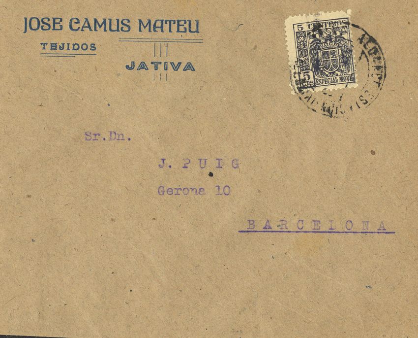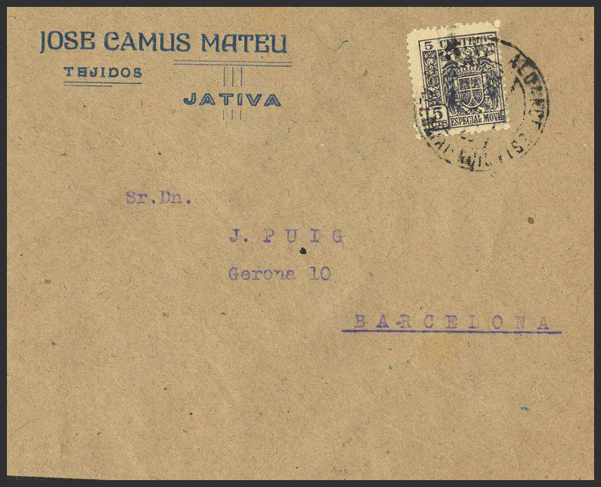 1938. 5 cts negro MOVIL. JATIVA a BARCELONA. MAGNIFICA CON RARO SELLO SIN CATALOGAR.