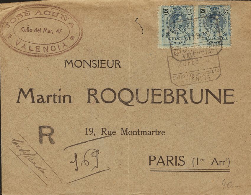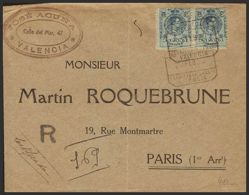 274(2). 1920. 25 cts azul, pareja. Certificado de VALENCIA a PARIS. MAGNIFICA.