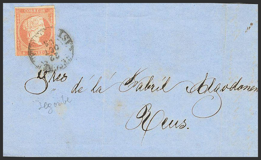 48. 1858. 4 cuartos rojo. SEGORBE a REUS. Matasello SEGORBE / CASTELLON DE LA P. (Tipo I). BONITA Y RARA.