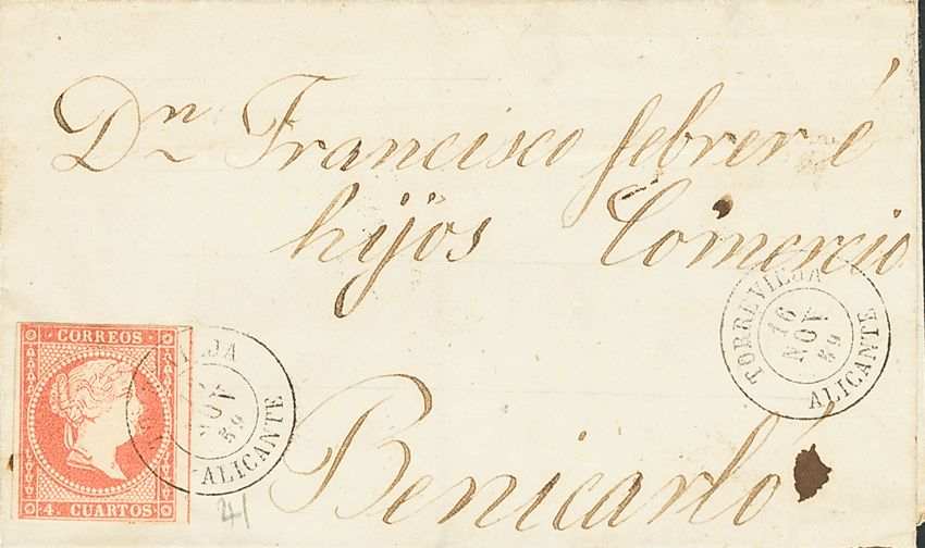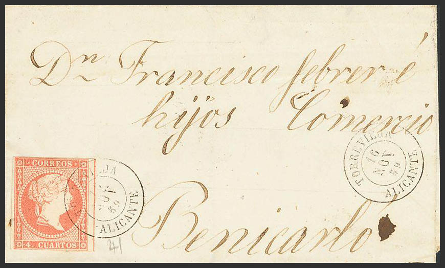 48. 1859. 4 cuartos rojo. TORREVIEJA a BENICARLO. Matasello TORREVIEJA / ALICANTE. MAGNIFICA.