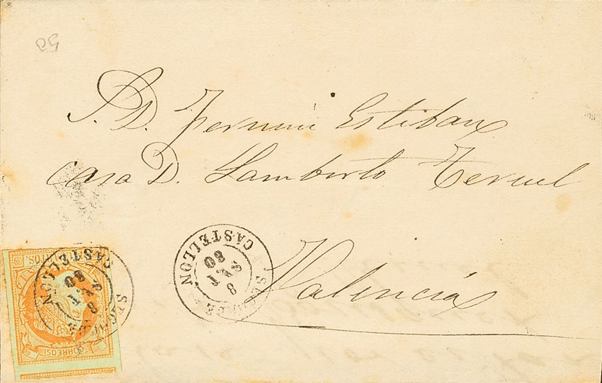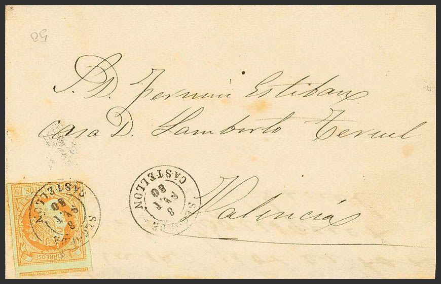 48. 1860. 4 cuartos amarillo. SEGORBE a VALENCIA. Matasello SEGORBE / CASTELLON. MAGNIFICA.