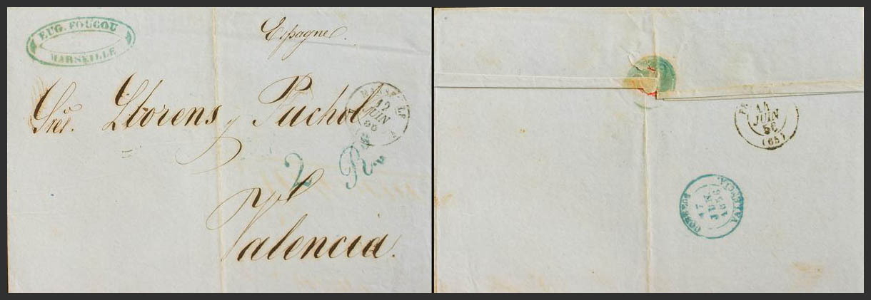 1856. MARSELLA a VALENCIA. Al dorso CORREOS / VALENCIA, en azul fechador especial de llegada (P.E.42) edición 2004. MAGNIFICA.