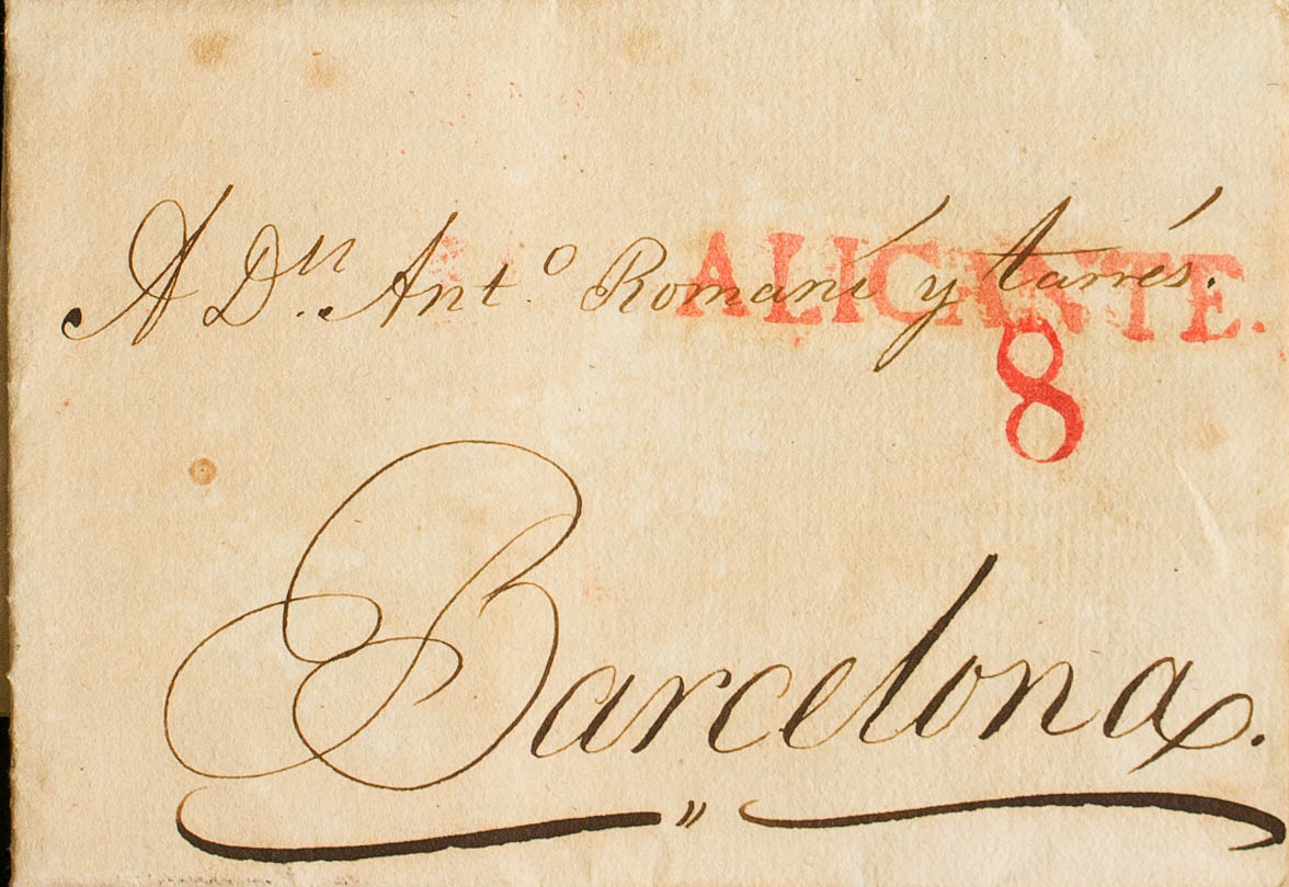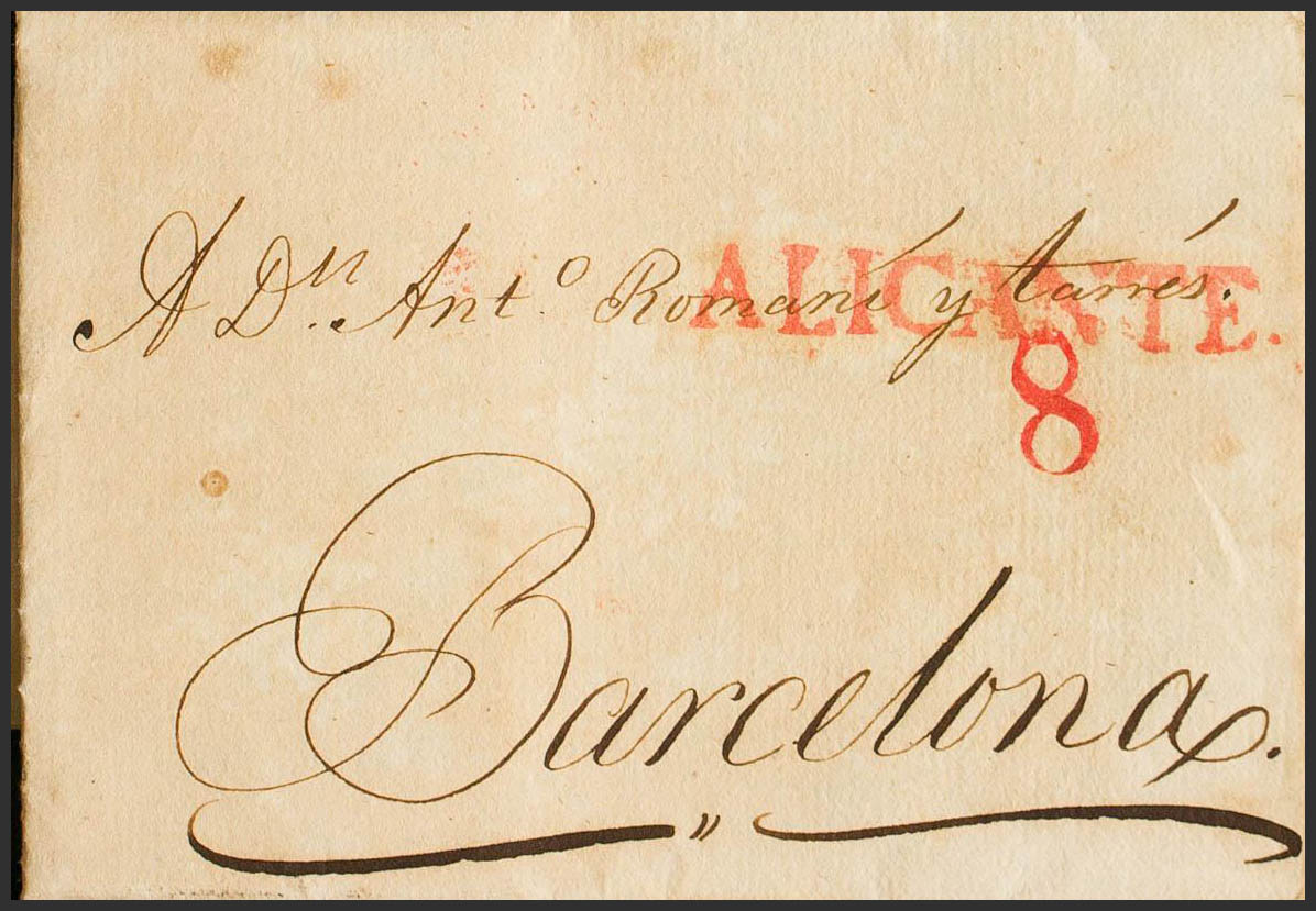 1836. CADIZ a BARCELONA. Marca ALICANTE, aplicada en tránsito (muy probablemente un encaminador la entregó al correo en Alicante) (P.E.14) edición 2004. MAGNIFICA.