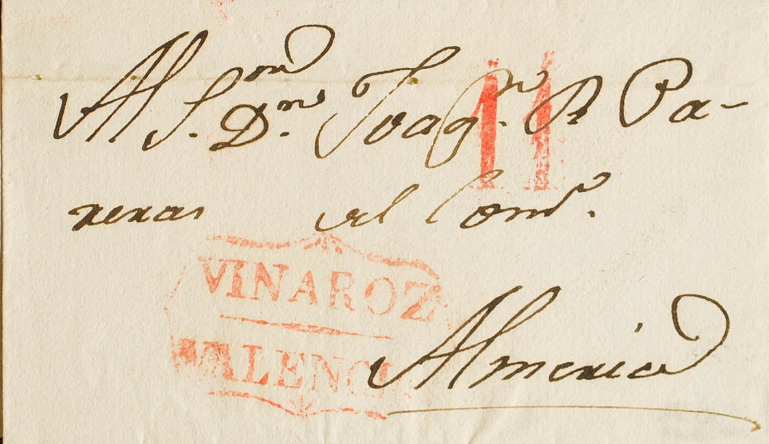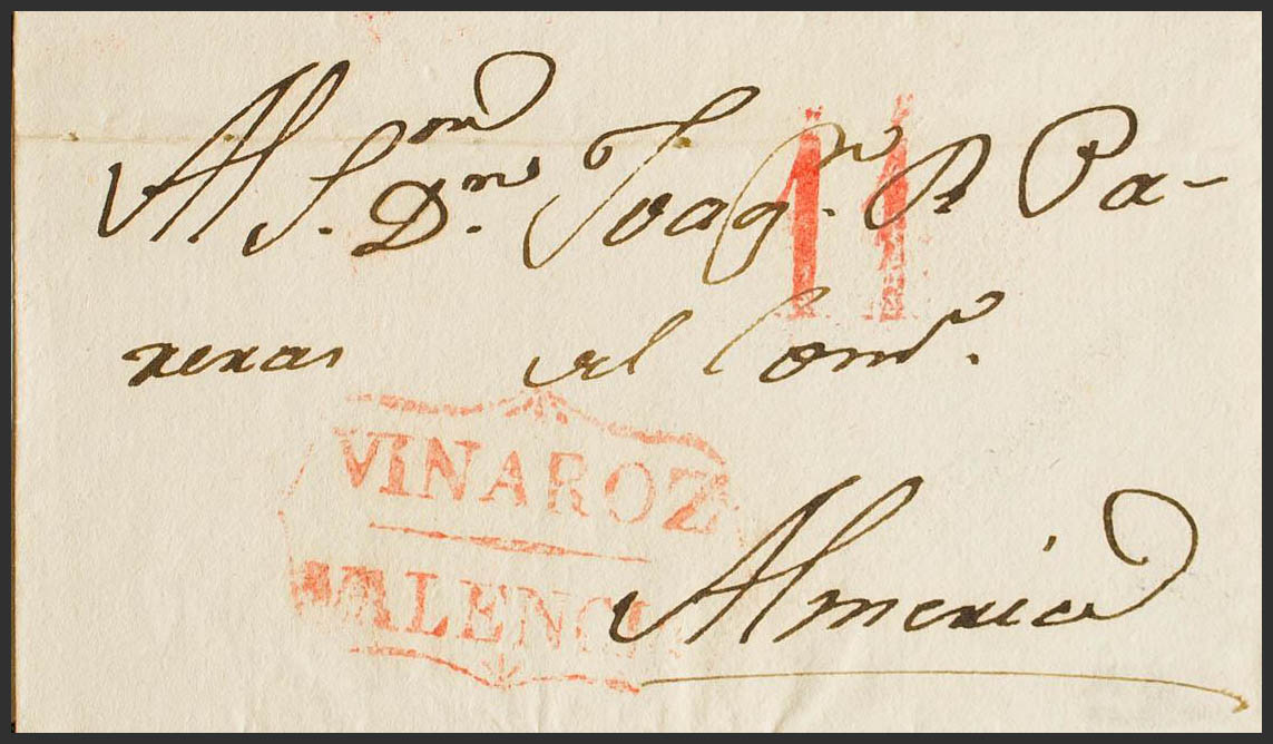 1843. VINAROZ a ALMERIA. Marca VINAROZ / VALENCIA (P.E.7) edición 2004. MAGNIFICA Y RARA.