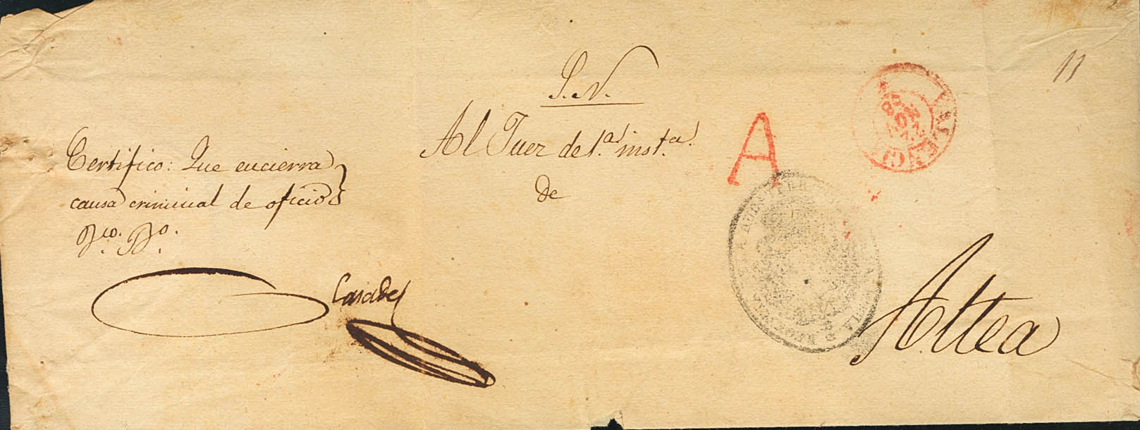1858. Plica Judicial de VALENCIA a ALTEA. Marca "A", en rojo de abono de Valencia (P.E.37) edición 2004. MAGNIFICA.