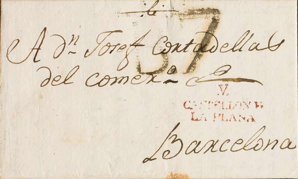 1808. CASTELLON a BARCELONA. Marca V. / CASTELLON DE / LA PLANA, en rojo (P.E.3) edición 2004. MAGNIFICA Y MUY RARA.