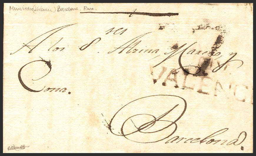 1806. MURVIEDRO a BARCELONA. Marca MV / VALENCIA, en tinta de escribir (P.E.3 ). MAGNIFICA Y RARA.