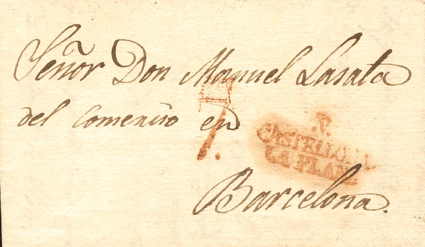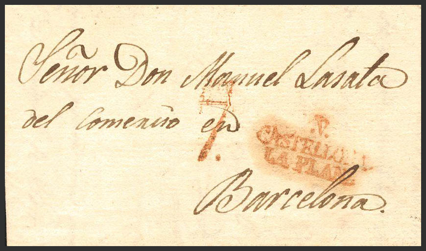 1825. CASTELLON a BARCELONA. Marca V / CASTELLON DE / LA PLANA (P.E.6) edición 2004. MAGNIFICA.