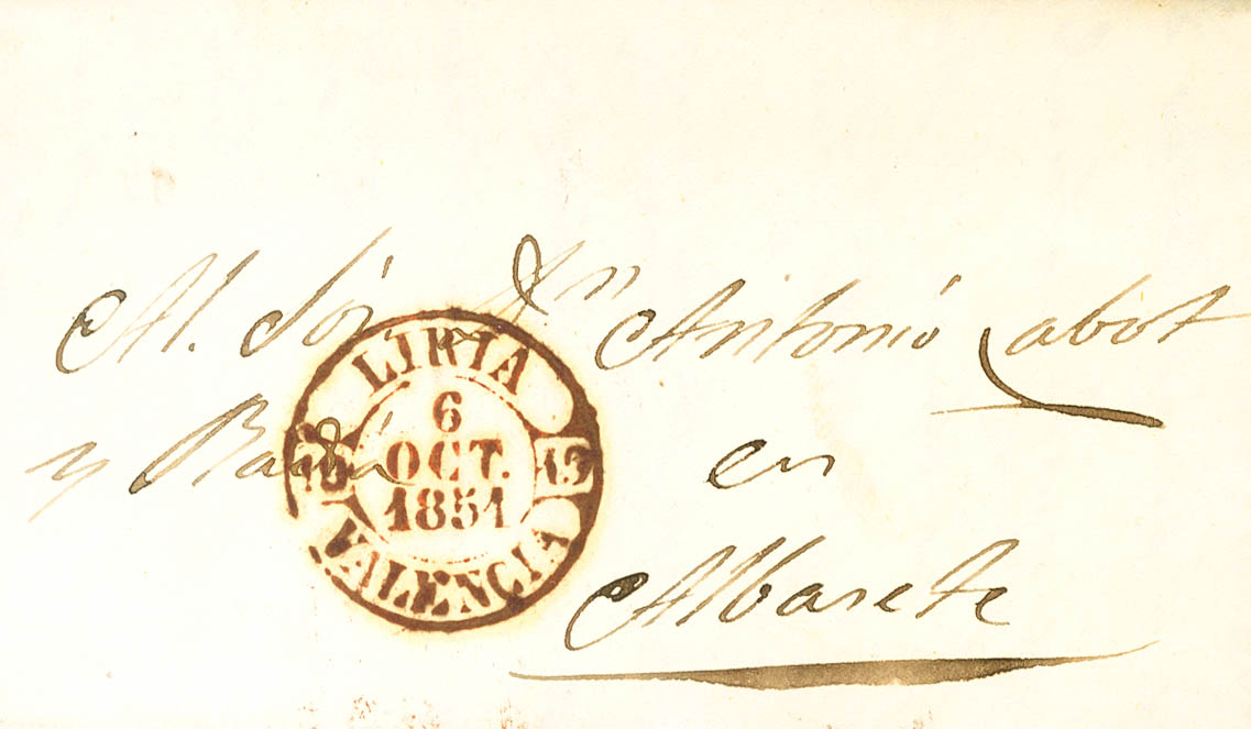 1851. VILLAMARCHANTE (VALENCIA) a ALBACETE. Baeza LIRIA / VALENCIA, en rojo. MAGNIFICA Y RARA.