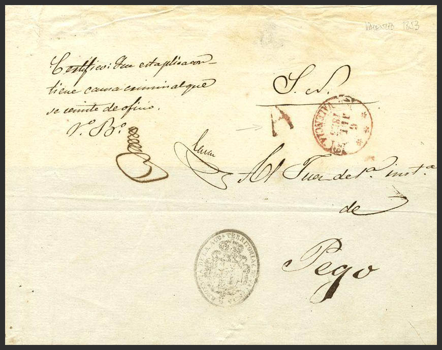1853. Plica Judicial de VALENCIA a PEGO. Marca "A", en rojo de abono (P.E.37) edición 2004. MAGNIFICA.