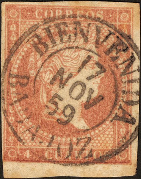 48. 1856. 4 cuartos rojo. Matasello BIENVENIDA / BADAJOZ (Tipo I). MAGNIFICO.