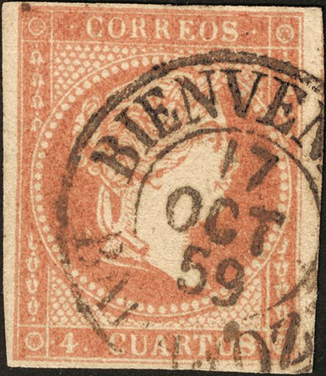 48. 1856. 4 cuartos rojo. Matasello BIENVENIDA / BADAJOZ (Tipo I).