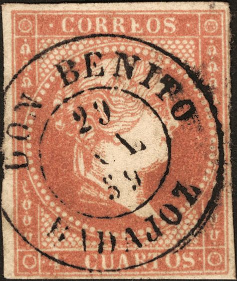 48. 1856. 4 cuartos rojo. Matasello DON BENITO / BADAJOZ. MAGNIFICO.