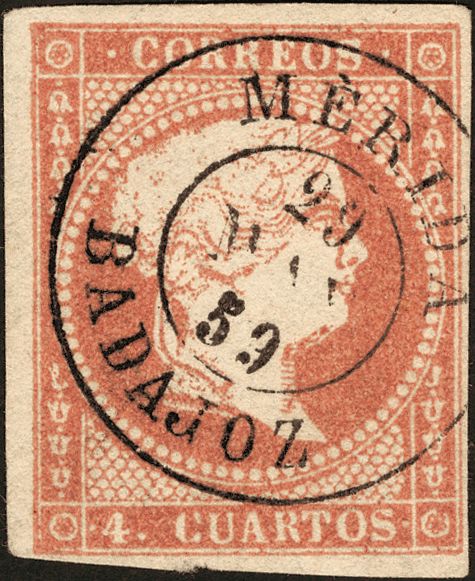 48. 1856. 4 cuartos rojo. Matasello MERIDA / BADAJOZ. MAGNIFICO.
