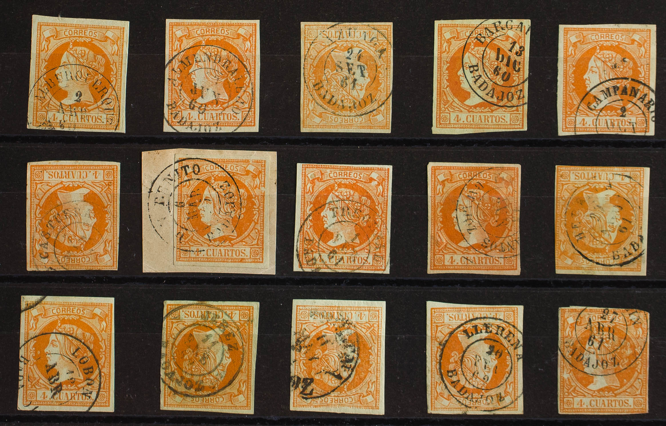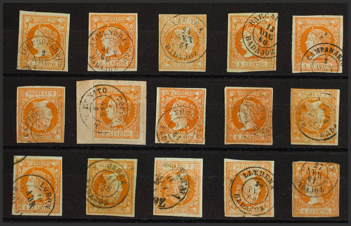 52(22). 1860. Conjunto de veintidós sellos del 4 cuartos amarillo inutilizados con los fechadores de la provincia de Badajoz: ALBURQUERQUE, ALMENDRALEJO, AZUAGA, BARCARROTA, CAMPANARIO, CASTUERA, DON BENITO, FREGENAL, FUENTE DE CANTOS, HERRERA, JEREZ, LOBON, LLERENA (Tipo I y Tipo II), MEDELLIN, MERIDA, OLIVENZA, PUEBLA DE ALCOCER, SAN VICENTE, SIRUELA, VILLAFRANCA DE LOS BARROS y ZAFRA. MAGNIFICO.