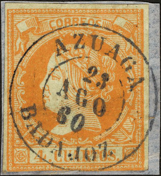 52. 1860. 4 cuartos amarillo. Matasello AZUAGA / BADAJOZ, en azul. LUJO.
