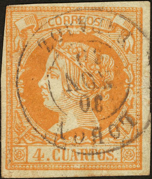 52. 1860. 4 cuartos amarillo. Matasello LOBON / BADAJOZ.
