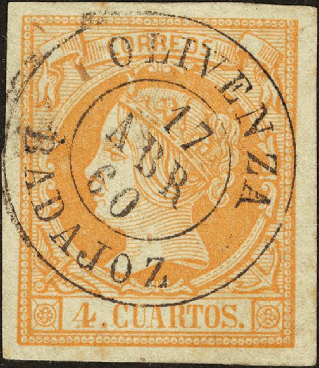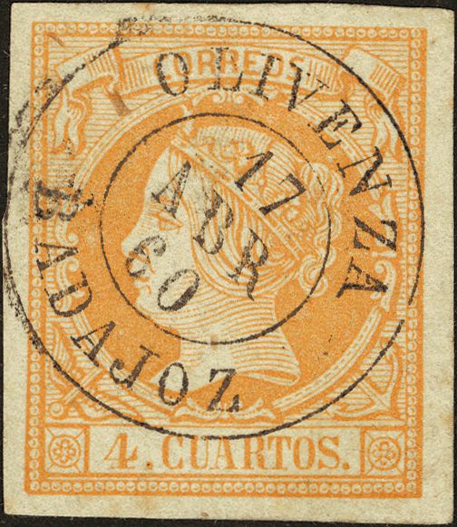 52. 1860. 4 cuartos amarillo. Matasello OLIVENZA / BADAJOZ. LUJO.