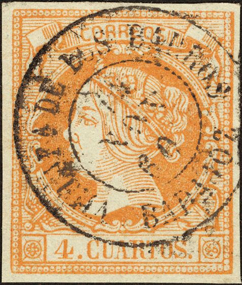 52. 1860. 4 cuartos amarillo. Matasello VILLª DE LOS BARROS / BADAJOZ.