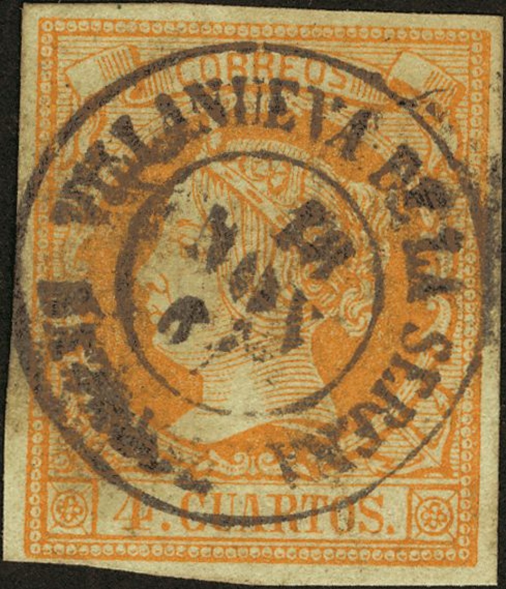 52. 1860. 4 cuartos amarillo. Matasello VILLANUEVA DE LA SERENA / BADAJOZ.