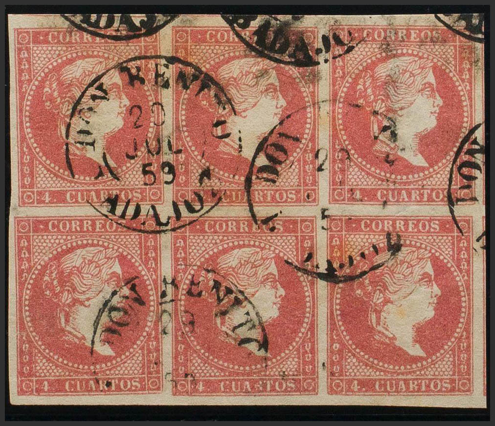 48(6). 1856. 4 cuartos rojo, bloque de seis. Matasello DON BENITO / BADAJOZ (Tipo I). MAGNIFICO.
