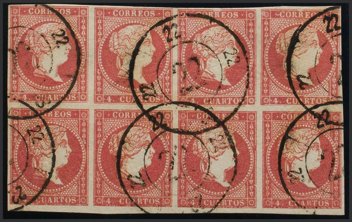 48(8). 1856. 4 cuartos rojo, bloque de ocho. Matasello R.CARRETA Nº 22, de Cáceres. MAGNIFICO.
