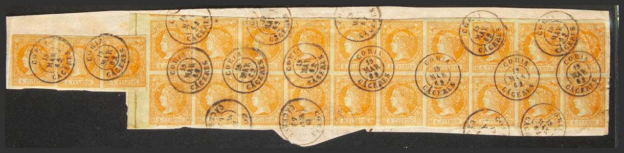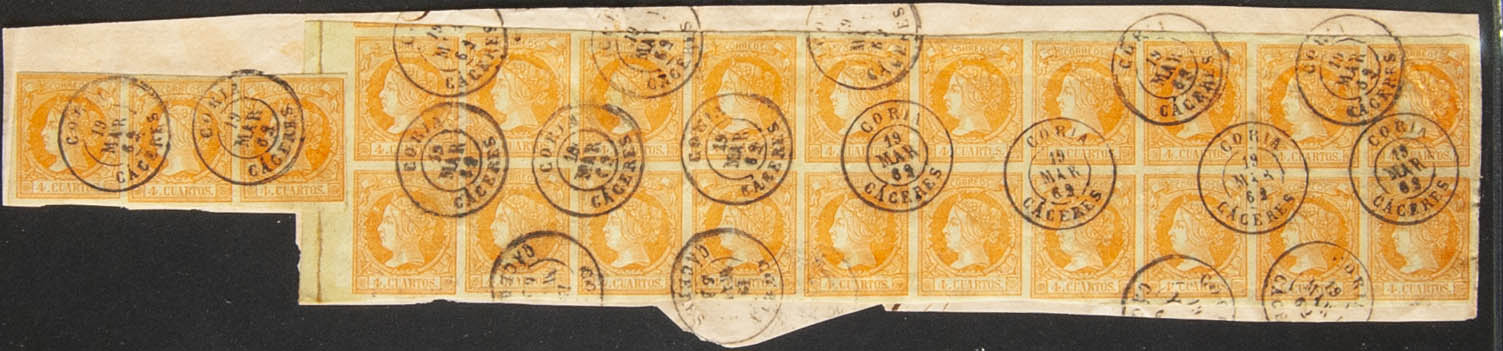 52(23). 1854. 4 cuartos amarillo, bloque de veinte y tira de tres, sobre fragmento. Matasello CORIA / CACERES. MAGNIFICO.