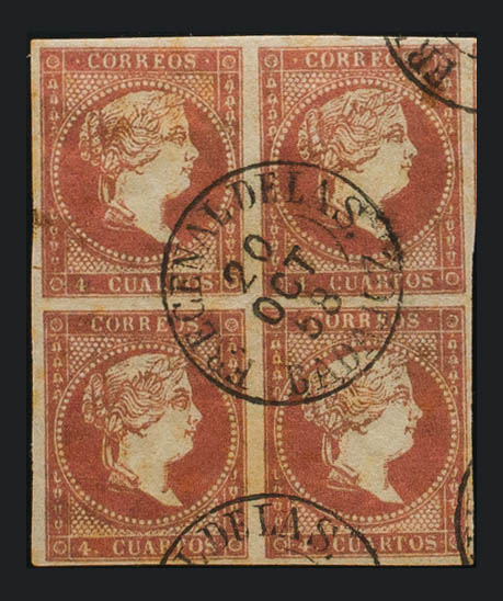 48(4). 1855. 4 cuartos rojo, bloque de cuatro. Matasello FREGENAL DE LA S. / BADAJOZ (Tipo I). MAGNIFICO Y RARO.