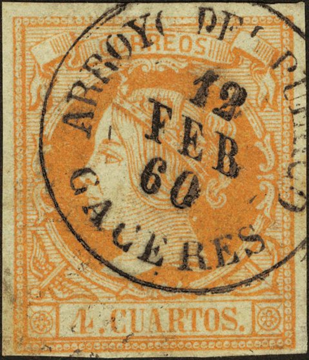 52. 1860. 4 cuartos amarillo. Matasello ARROYO DEL PUERCO / CACERES.