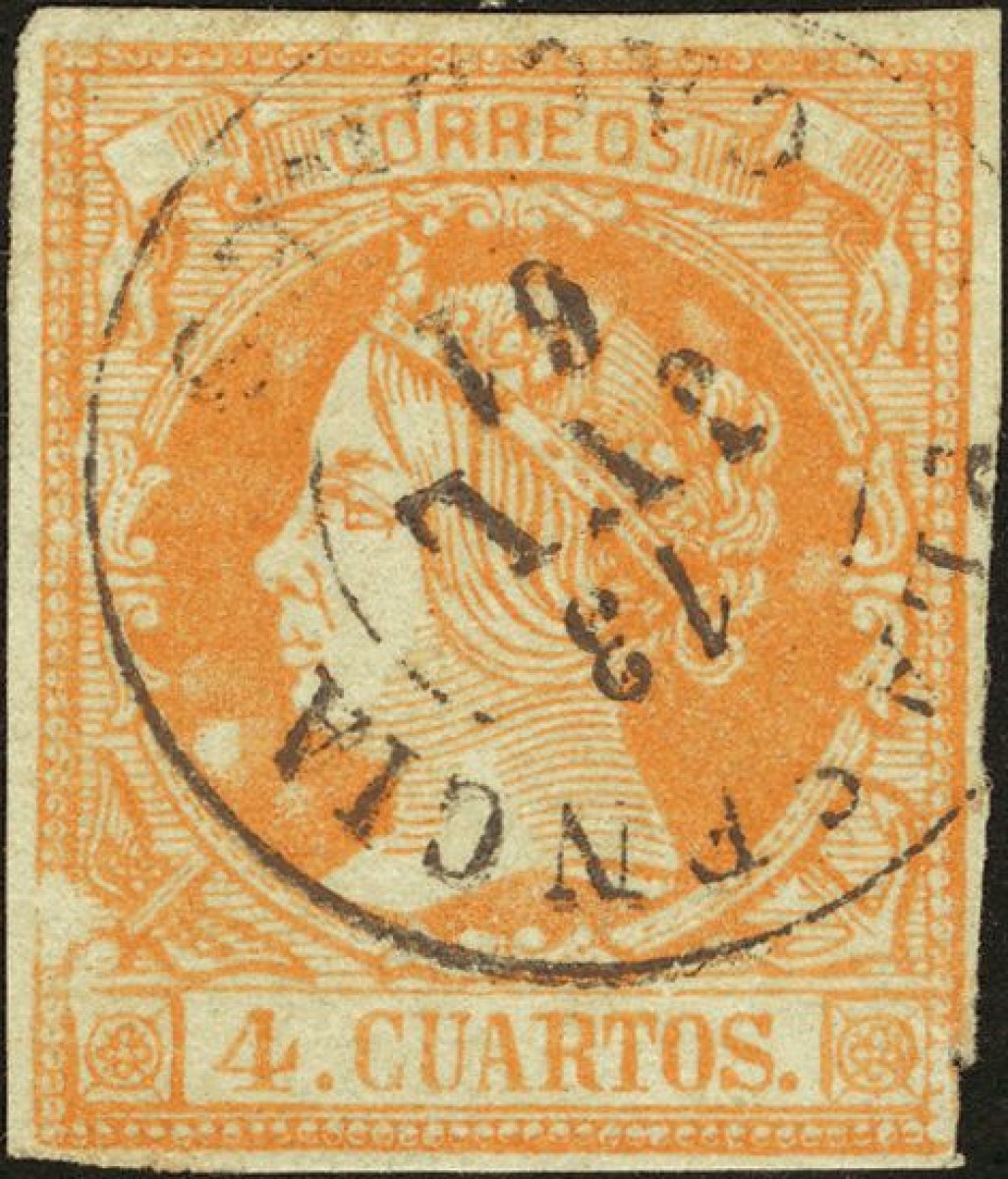 52. 1860. 4 cuartos amarillo. Matasello PLASENCIA / CACERES.
