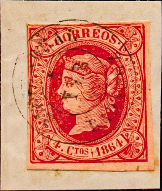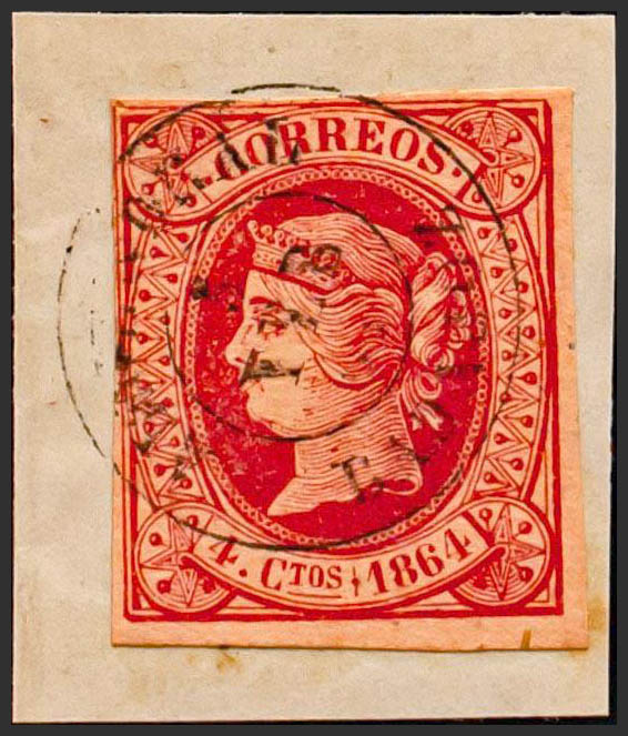 △ 64. 1864. 4 cuartos rosa, sobre fragmento. Matasello ALMENDRAL / BADAJOZ. MAGNIFICO Y MUY RARO.