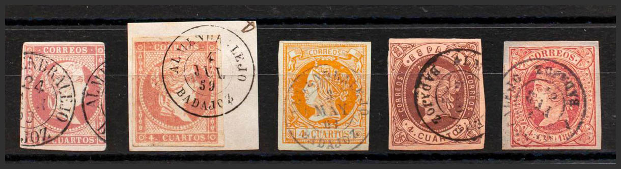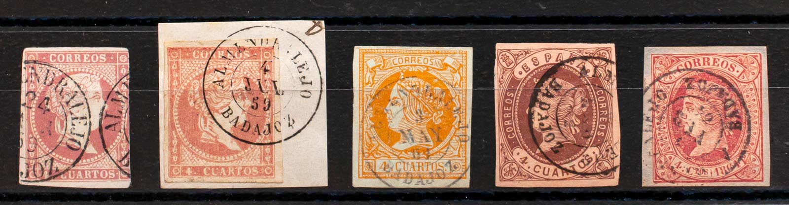 48(2), 52, 58, 64. (1855ca). Conjunto de cinco sellos del 4 cuartos rojo, amarillo, castaño y rosa, inutilizados con el matasello ALMENDRALEJO / BADAJOZ (incluyendo el Tipo I sobre el 4 cuartos rojo). MAGNIFICO.
