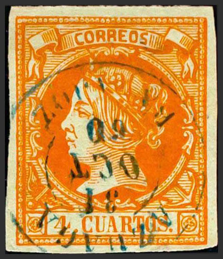 52. 1860. 4 cuartos naranja. Matasello AZUAGA / BADAJOZ, en azul. MAGNIFICO Y MUY RARO.