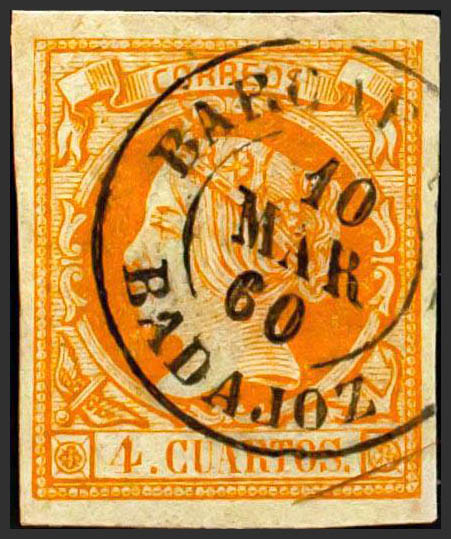 52. 1860. 4 cuartos naranja. Matasello BARCARROTA / BADAJOZ. MAGNIFICO.