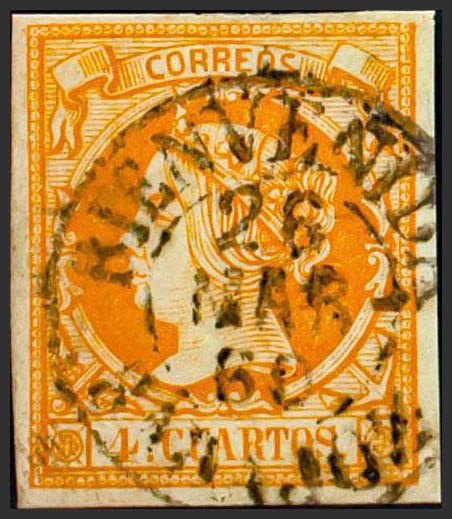 52. 1860. 4 cuartos naranja. Matasello BIENVENIDA / BADAJOZ (Tipo I). MAGNIFICO.